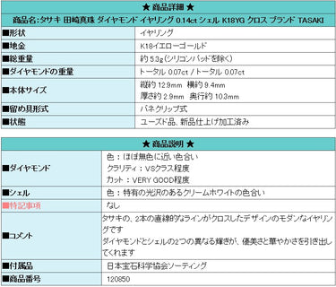 Product name: TASAKI Tasaki Pearl Diamond Earrings 0.14ct Shell K18YG Cross Brand TASAKI