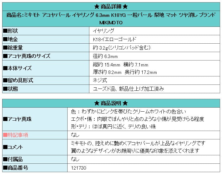 Product name: MIKIMOTO Akoya pearl earrings 6.3mm K18YG single pearl matte finish Brand: MIKIMOTO