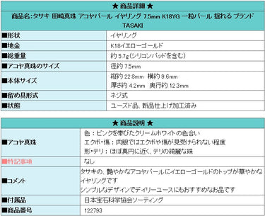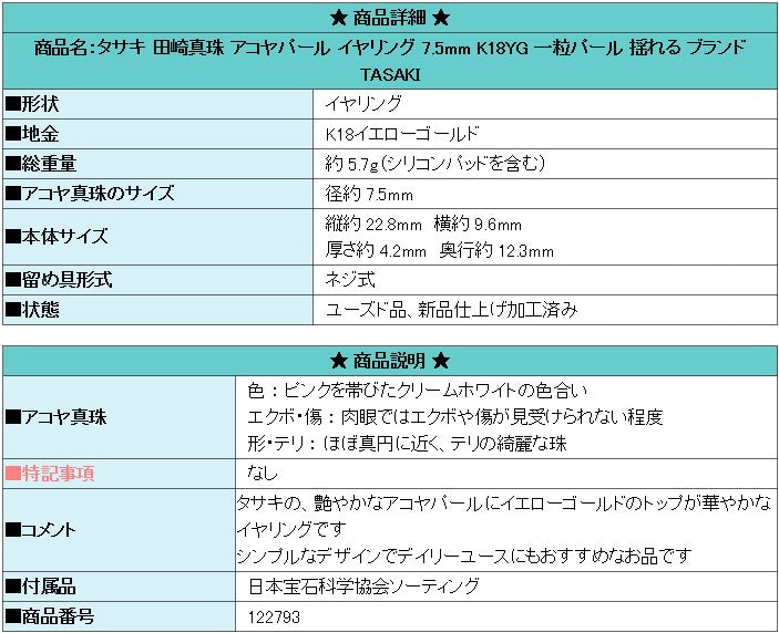 Product name: TASAKI Akoya pearl earrings 7.5mm K18YG single pearl dangling brand TASAKI
