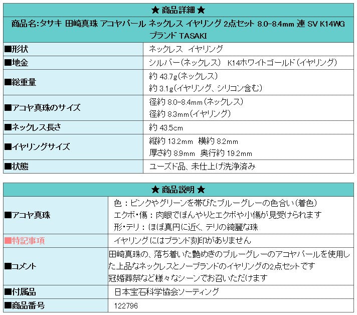 Product name: TASAKI Akoya pearl necklace and earrings set of 2, 8.0-8.4mm, string, SV, K14WG, brand: TASAKI