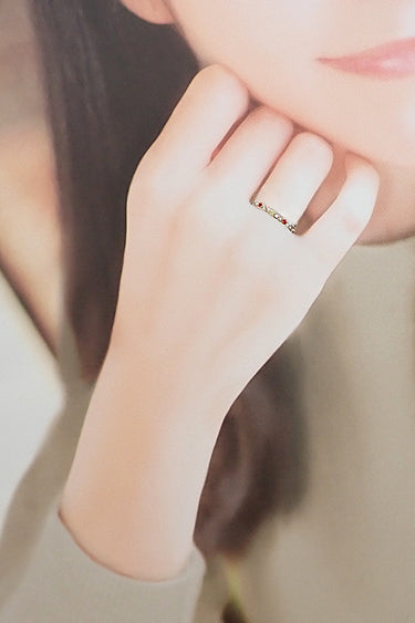 コメント 濃いレッドオレンジとイエローサファイアのビタミンカラーにパワーをもらえそうなポップなリングです。細めのアームなので、お気に入りのリングとの重ねづけもしやすいお品です。