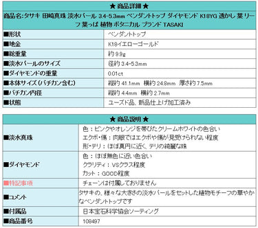Product name: TASAKI Tasaki Pearl Freshwater Pearl 3.4-5.3mm Pendant Top Diamond K18YG Openwork Leaf Leaf Plant Botanical Brand TASAKI