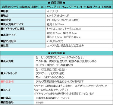 Product name: TASAKI Tasaki Pearl Freshwater Pearl Earrings 6.6-7.5mm Diamond K14WG Brand TASAKI