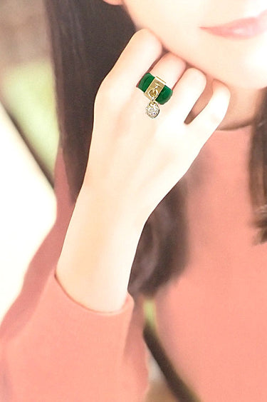 コメント ジュエルスタジオの、色鮮やかなヒスイをそのままアームに使用した、ユニークな雰囲気のリングです。錠前のようなモチーフの先にはハートチャームがころころと揺れ、ダイヤモンドの華やかな煌めきをお手元に添えてくれます。