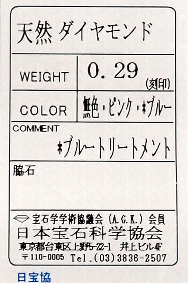 ダイヤモンド 色:ほぼ無色に近い色合い・ライトピンク・ライトブルー