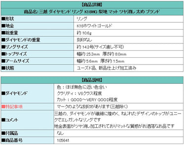 Product name: Mitsukoshi Diamond Ring K18WG Matte finish Thick Brand