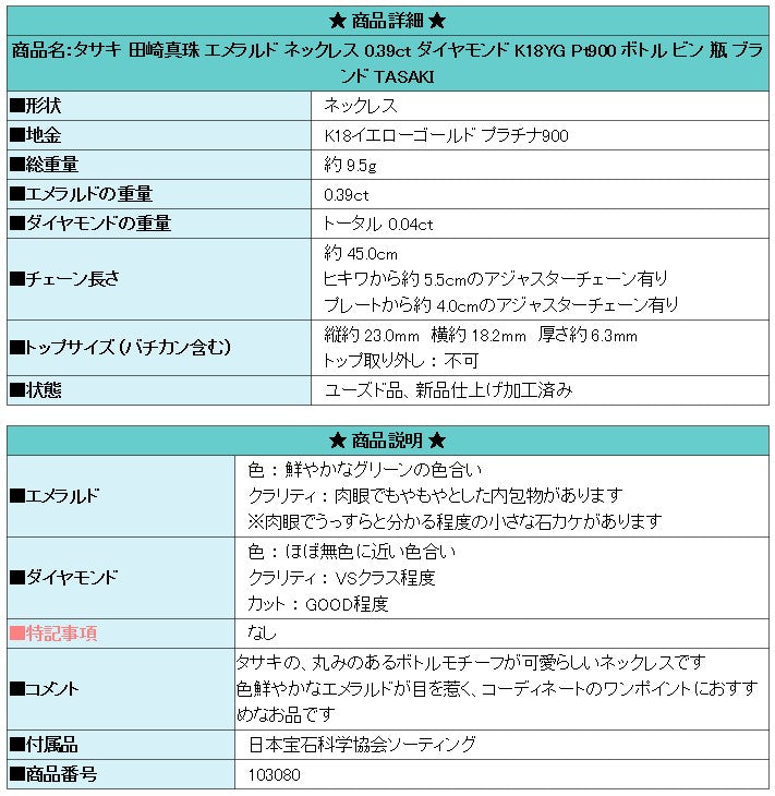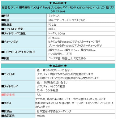 Product name: TASAKI Tasaki Pearl Emerald Necklace 0.39ct Diamond K18YG Pt900 Bottle Bottle Brand TASAKI