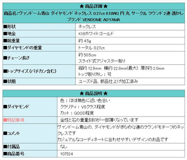 Product name: Vendome Aoyama Diamond Necklace 0.27ct K18WG Circle Round Double Strand Openwork Brand VENDOMEAOYAMA
