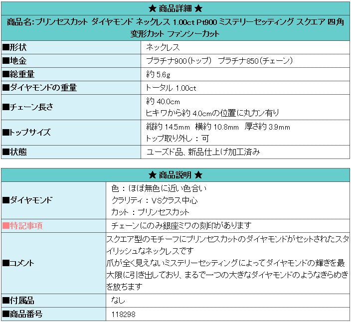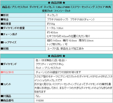 Product name: Princess cut diamond necklace 1.00ct Pt900 mystery setting square rectangular irregular cut fancy cut