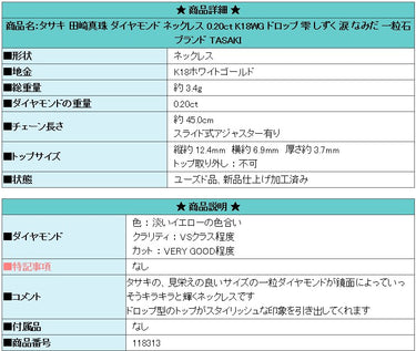 Product name: TASAKI Diamond Necklace 0.20ct K18WG Drop Tear Single Stone Brand TASAKI