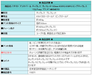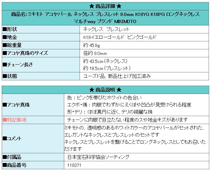 Product name: MIKIMOTO Akoya pearl necklace bracelet 8.0mm K18YG K18PG long necklace multi-way brand MIKIMOTO