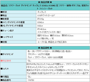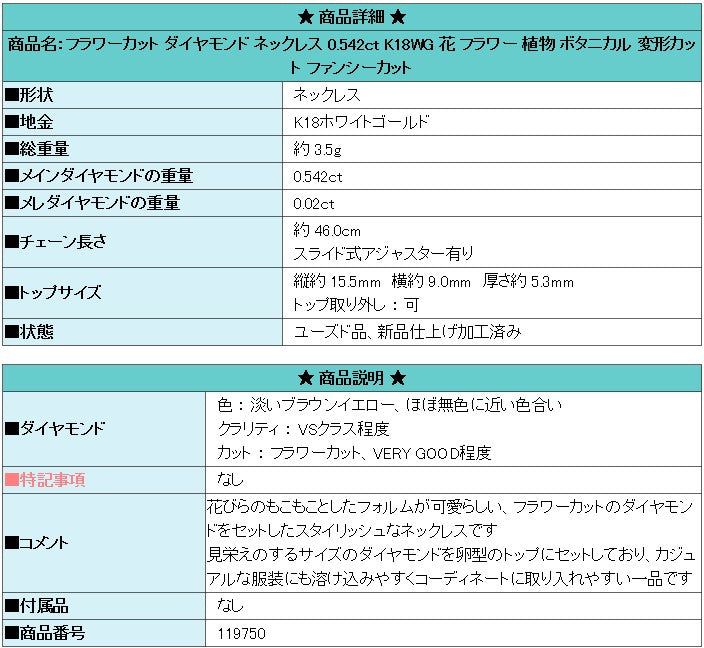 Product name: Flower cut diamond necklace 0.542ct K18WG flower plant botanical deformed cut fancy cut