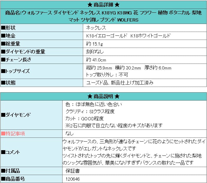 Product name: Wolfers Diamond Necklace K18YG K18WG Flower Plant Botanical Pear-textured Matte Brand WOLFERS