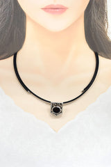 A cool necklace from Caracci featuring dark sapphires set in a black-plated openwork motif.
