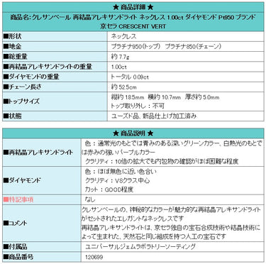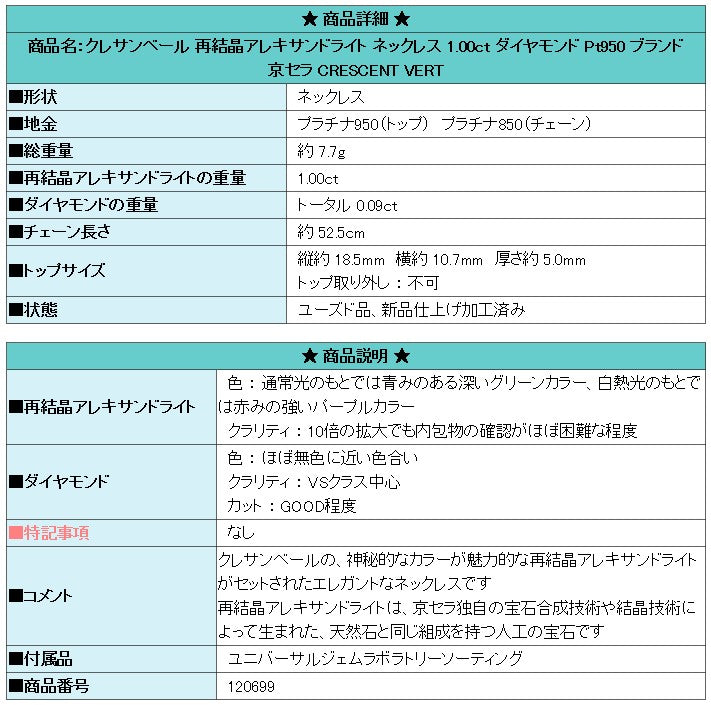 Product name: Cresent Vert Recrystallized Alexandrite Necklace 1.00ct Diamond Pt950 Brand Kyocera CRESCENT VERT
