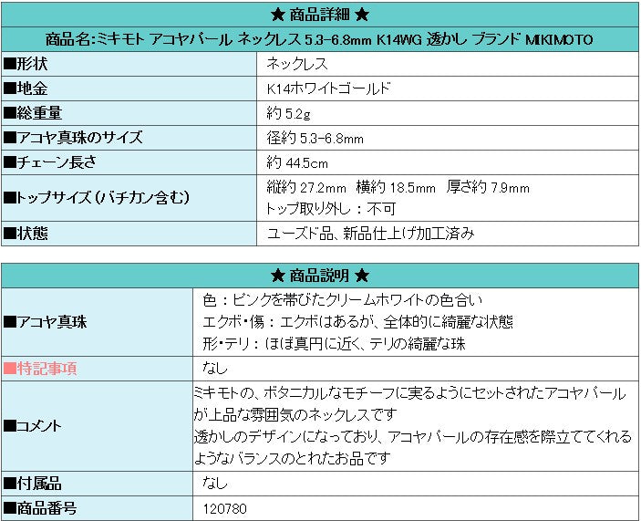 Product name: MIKIMOTO Akoya pearl necklace 5.3-6.8mm K14WG openwork Brand MIKIMOTO