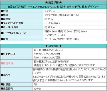 Product name: Nobuko Ishikawa Necklace Pt900 K18YG Combination Pear-grain Matte Writer Designer