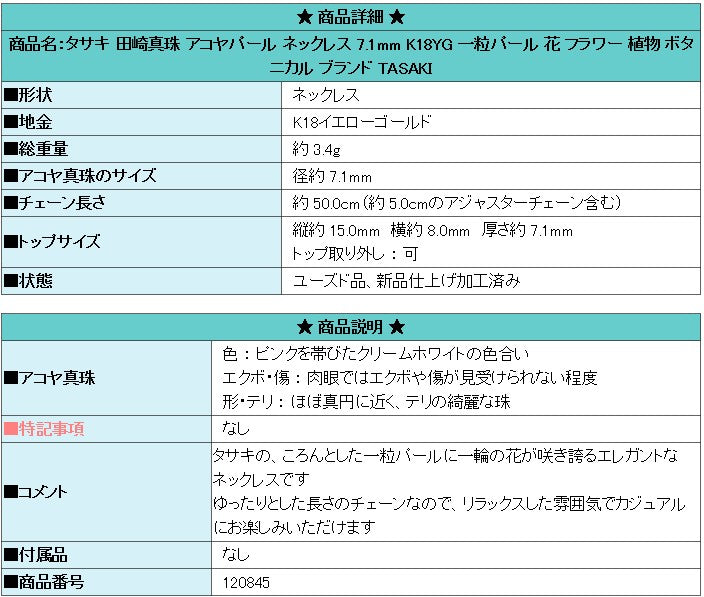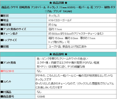 Product name: TASAKI Akoya pearl necklace 7.1mm K18YG single pearl flower plant botanical brand TASAKI