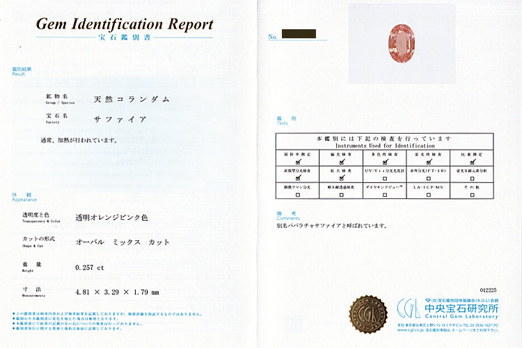パパラチアサファイア 色:ややオレンジを帯びたピンクの色合い