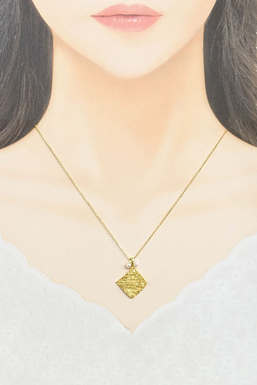 Comment This elegant Mikimoto necklace features a soft-lined square motif with a pearly matte finish. A small pearl set in the bail adds a delicate accent.