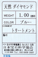 ダイヤモンド 色:やや淡いトリートブルー、ほぼ無色に近い色合い