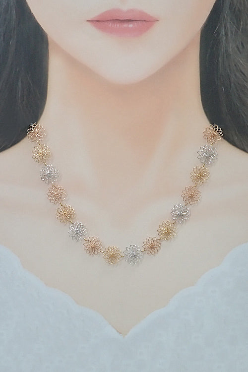コメント スリーカラーの色合いがお洒落で上品な雰囲気のネックレスです。細いラインで描かれたフラワーモチーフがキラキラと煌めき、シンプルながらも大人可愛い印象を与えてくれる、デイリーユースにもおすすめのお品です。