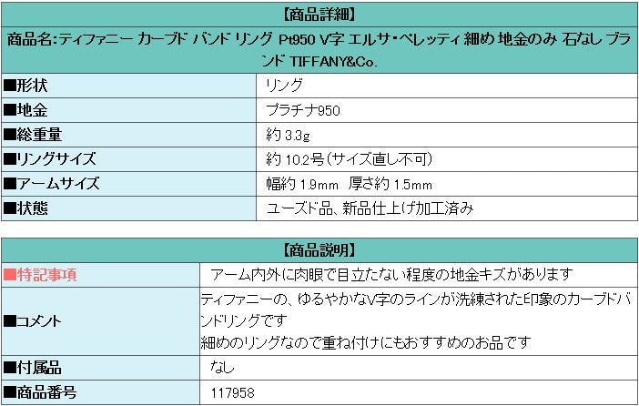Product name: Tiffany Curved Band Ring, Pt950, V-Shape, Elsa Peretti, Thin, Base Metal Only, No Stones, Brand: TIFFANY&Co.