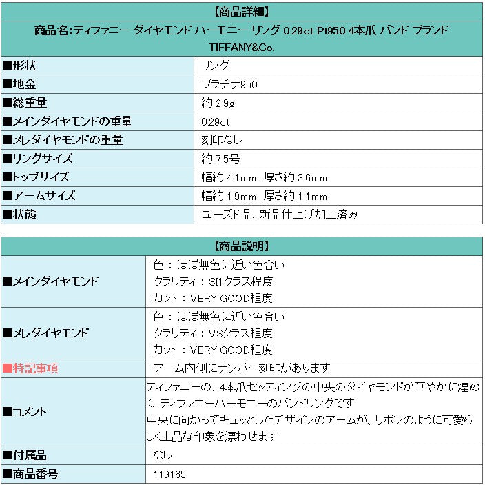 Product name: Tiffany Diamond Harmony Ring 0.29ct Pt950 4-prong band Brand: TIFFANY&Co.