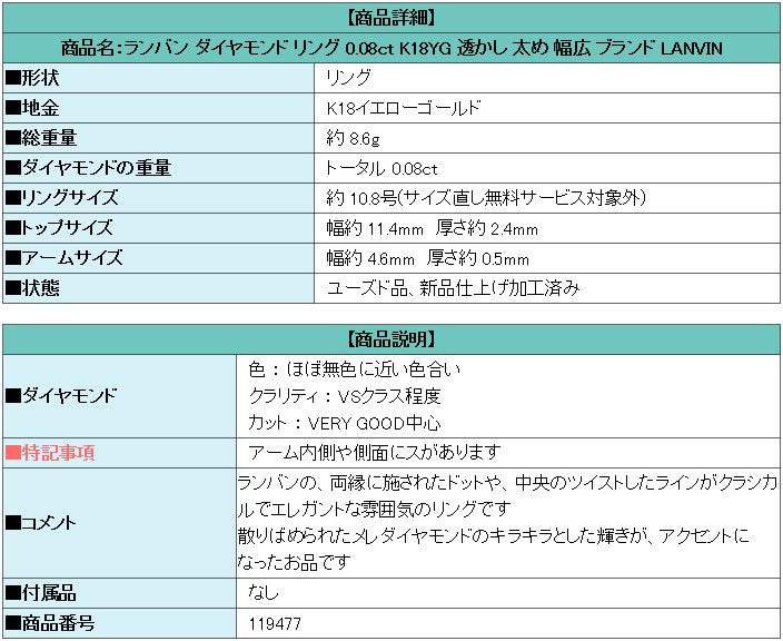 Product name: LANVIN Diamond Ring 0.08ct K18YG Openwork Thick Wide Brand LANVIN