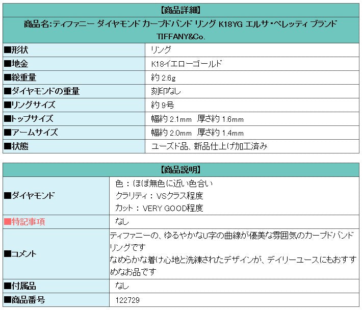 Product name: Tiffany Diamond Curved Band Ring K18YG Elsa Peretti Brand TIFFANY&Co.