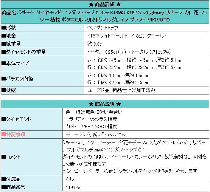 Product name: MIKIMOTO Diamond Pendant Top 0.25ct K18WG K18PG Multi-way Reversible Flower Plant Botanical Milled Millgrain Brand MIKIMOTO