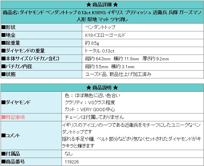 Product name: Diamond pendant top 0.13ct K18YG British Guardsman figure matte finish