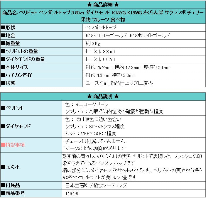 Product name: Peridot pendant top 3.85ct diamond K18YG K18WG cherry fruit food