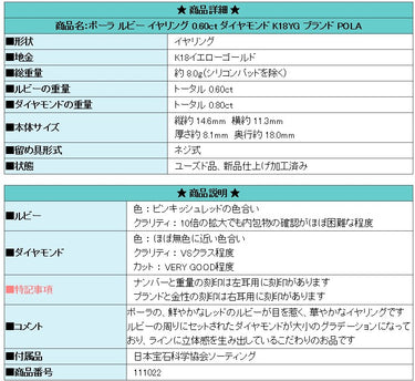 Product name: POLA Ruby Earrings 0.60ct Diamond K18YG Brand POLA