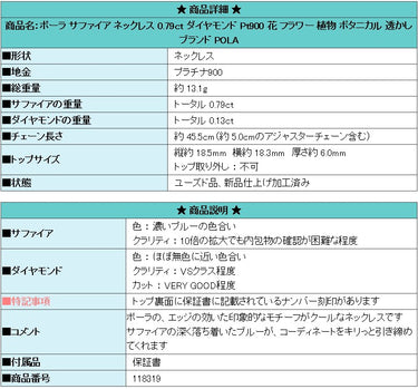Product name: POLA Sapphire Necklace 0.79ct Diamond Pt900 Flower Plant Botanical Openwork Brand POLA