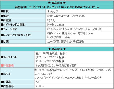 Product name: POLA Diamond Necklace 0.16ct K18YG Pt900 Brand POLA