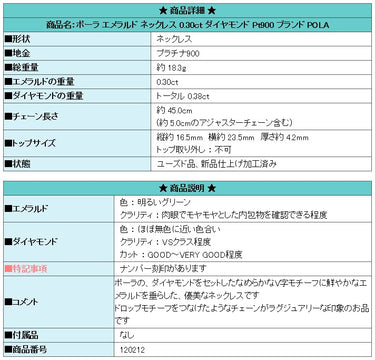Product name: POLA Emerald Necklace 0.30ct Diamond Pt900 Brand POLA