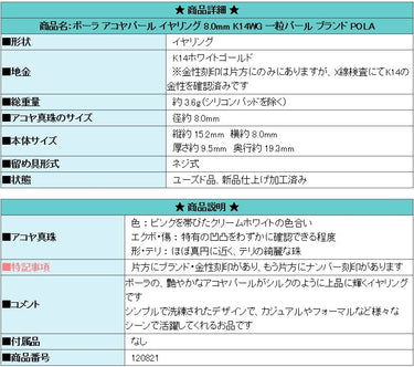 Product name: POLA Akoya pearl earrings 8.0mm K14WG single pearl Brand POLA
