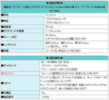 Product name: Vendome Aoyama Diamond Necklace 0.14ct Pt950 3-row Cube Brand VENDOME AOYAMA