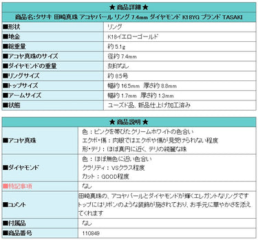 Product name: TASAKI Akoya pearl ring 7.4mm diamond K18YG Brand: TASAKI