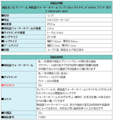Product name: CRESCENT VERT Recrystallized Water Opal Ring 2.01ct Diamond K18YG Brand Kyocera CRESCENT VERT