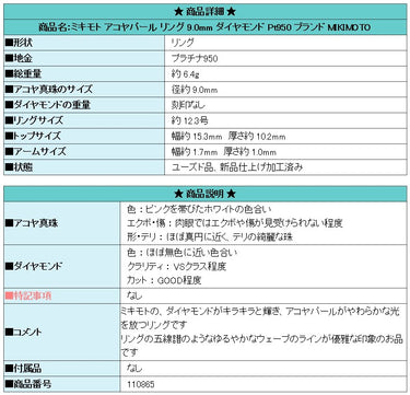 Product name: MIKIMOTO Akoya pearl ring 9.0mm diamond Pt950 Brand MIKIMOTO