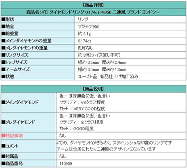 Product name: 4℃ Diamond Ring 0.174ct Pt950 Double-strand style Brand: 4℃