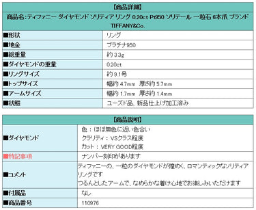 Product name: Tiffany Diamond Solitaire Ring 0.20ct Pt950 Solitaire Single Stone 6 Prongs Brand: TIFFANY&Co.
