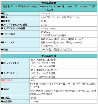 Product name: TASAKI Diamond Necklace 0.15ct K18YG K18WG Circle Round 3way Brand TASAKI