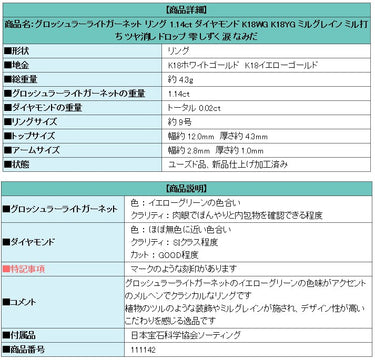 Product name: Grossularite Garnet Ring 1.14ct Diamond K18WG K18YG Milgrain Milled Matte Drop Droplet Tear