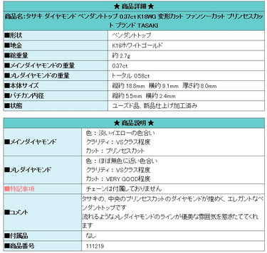 Product name: TASAKI Diamond Pendant Top 0.37ct K18WG Deformed Cut Fancy Cut Princess Cut Brand TASAKI
