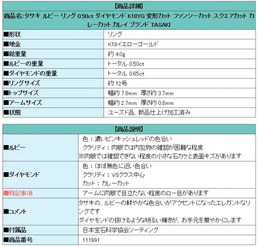 Product name: TASAKI Ruby Ring 0.50ct Diamond K18YG Deformed Cut Fancy Cut Square Cut Curry Cut Flatfish Brand TASAKI