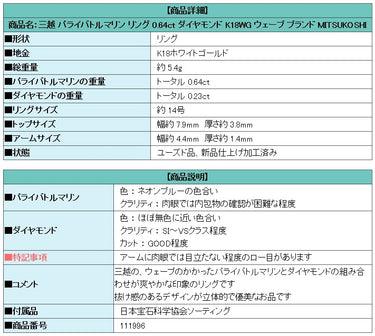 Product name: Mitsukoshi Paraiba Tourmaline Ring 0.64ct Diamond K18WG Wave Brand MITSUKOSHI