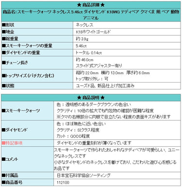 Product name: Smoky quartz necklace 5.46ct diamond K18WG teddy bear bear animal